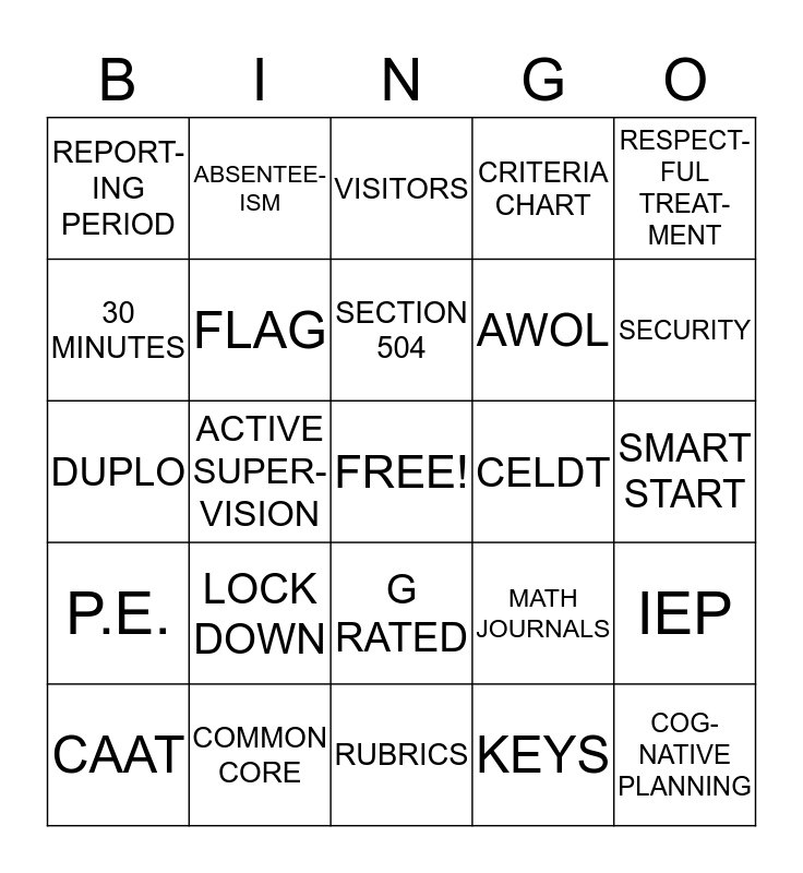 This bingo card has a free space and 24 words: LOCK DOWN, COMMON CORE, SECTION 504, CAAT, RESPECT-FUL TREAT- MENT, REPORT- ING PERIOD, 30 MINUTES, ABSENTEE-ISM, CELDT, G RATED, AWOL, DUPLO, MATH JOURNALS, IEP, FLAG, KEYS, SMART START, VISITORS, SECURITY, ACTIVE SUPER- VISION, COG- NATIVE PLANNING, P.E., CRITERIA CHART and RUBRICS.