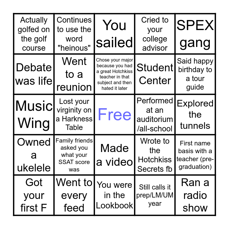 This bingo card has a free space and 24 words: Family friends asked you what your SSAT score was, Went to every feed, Chose your major because you had a great Hotchkiss teacher in that subject and then hated it later, Got your first F, SPEX gang, Actually golfed on the golf course, Debate was life, Continues to use the word "heinous", Performed at an auditorium /all-school, Made a video, Student Center, Music Wing, Wrote to the Hotchkiss Secrets fb, First name basis with a teacher (pre-graduation), Went to a reunion, Still calls it prep/LM/UM year, Explored the tunnels, You sailed, Said happy birthday to a tour guide, Lost your virginity on a Harkness Table, Ran a radio show, Owned a ukelele, Cried to your college advisor and You were in the Lookbook.