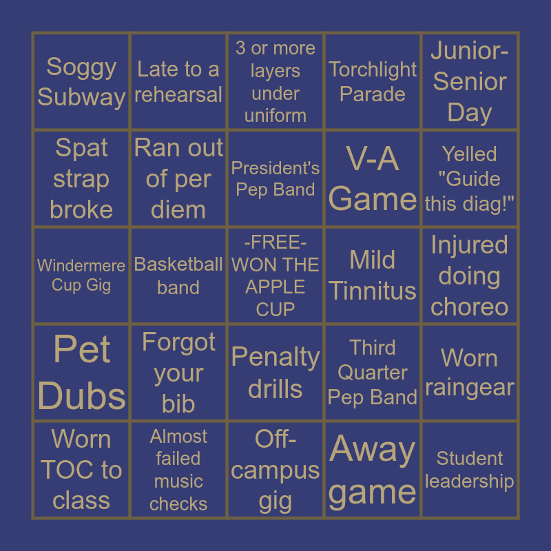 This bingo card has a free space and 24 words: Forgot your bib, Almost failed music checks, President's Pep Band, Worn TOC to class, Junior-Senior Day, Soggy Subway, Spat strap broke, Late to a rehearsal, Mild Tinnitus, Penalty drills, V-A Game, Windermere Cup Gig, Third Quarter Pep Band, Worn raingear, Ran out of per diem, Away game, Injured doing choreo, 3 or more layers under uniform, Yelled "Guide this diag!", Basketball band, Student leadership, Pet Dubs, Torchlight Parade and Off-campus gig.