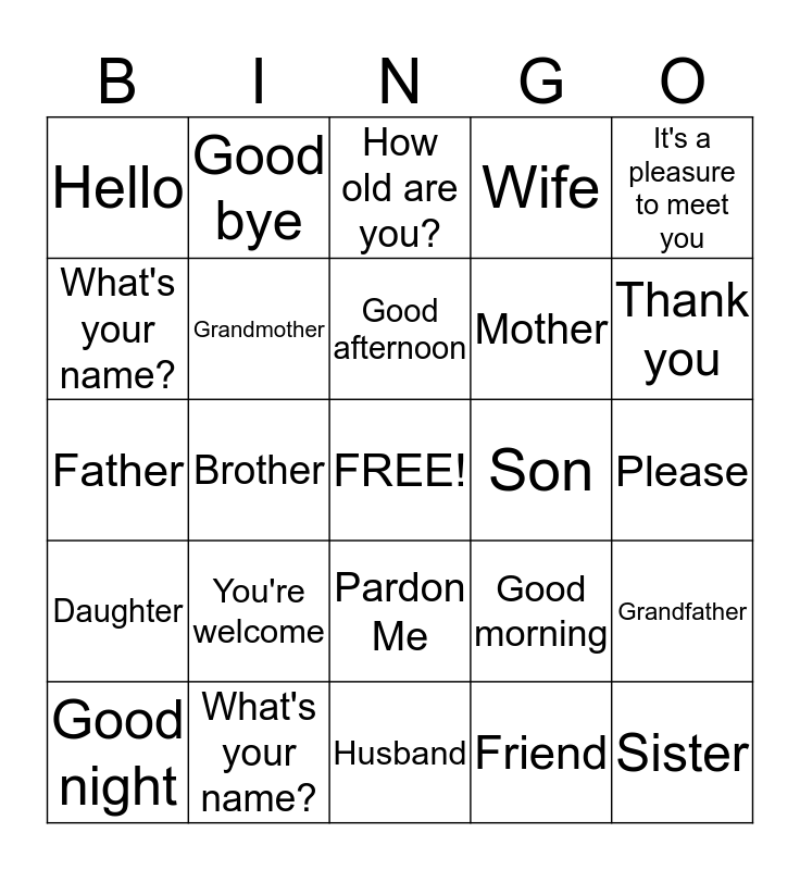 This bingo card has a free space and 24 words: You're welcome, What's your name?, Good afternoon, Good night, It's a pleasure to meet you, Hello, What's your name?, Good bye, Son, Pardon Me, Mother, Father, Good morning, Grandfather, Grandmother, Friend, Please, How old are you?, Thank you, Brother, Sister, Daughter, Wife and Husband.