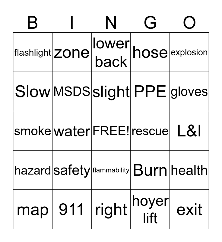 This bingo card has a free space and 27 words: Burn, mask, PPE, right, Slow, lower back, zone, hazard, rescue, health, smoke, hose, map, 911, gloves, reporting, MSDS, slight, safety, flashlight, L&I, hoyer lift, water, exit, flammability, explosion and exinguish.