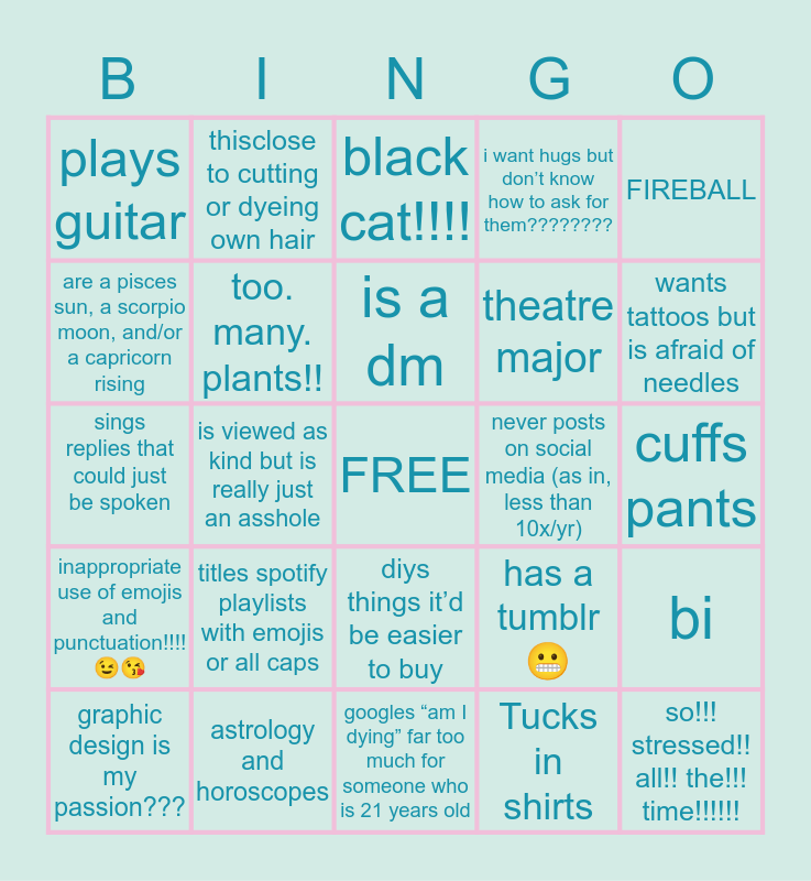 This bingo card has a free space and 24 words: titles spotify playlists with emojis or all caps, astrology and horoscopes, is a dm, graphic design is my passion???, FIREBALL, plays guitar, are a pisces sun, a scorpio moon, and/or a capricorn rising, thisclose to cutting or dyeing own hair, never posts on social media (as in, less than 10x/yr), diys things it’d be easier to buy, theatre major, sings replies that could just be spoken, has a tumblr 😬, bi, too. many. plants!!, Tucks in shirts, cuffs pants, black cat!!!!, wants tattoos but is afraid of needles, is viewed as kind but is really just an asshole, so!!! stressed!! all!! the!!! time!!!!!!, inappropriate use of emojis and punctuation!!!! 😉😘, i want hugs but don’t know how to ask for them???????? and googles “am I dying” far too much for someone who is 21 years old.