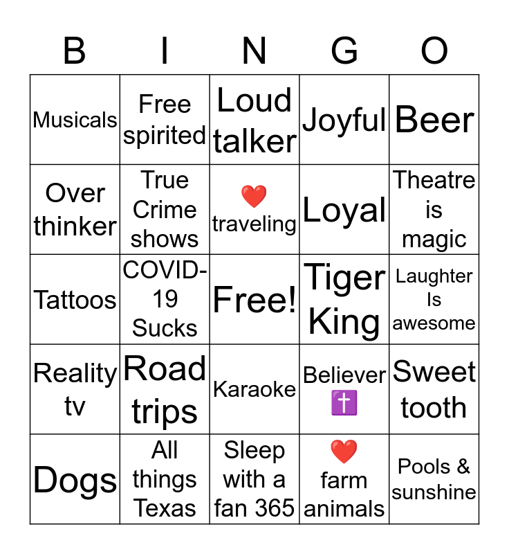 This bingo card has a free space and 24 words: Road trips, All things Texas, ❤️traveling, Dogs, Beer, Musicals, Over thinker, Free spirited, Tiger King, Karaoke, Loyal, Tattoos, Believer ✝️, Sweet tooth, True Crime shows, ❤️ farm animals, Laughter Is awesome, Loud talker, Theatre is magic, COVID-19 Sucks, Pools & sunshine, Reality tv, Joyful and Sleep with a fan 365.
