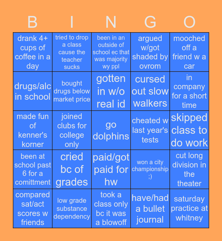 This bingo card has a free space and 24 words: cried bc of grades, low grade substance dependency, gotten in w/o real id, compared sat/act scores w friends, mooched off a friend w a car, drank 4+ cups of coffee in a day, drugs/alc in school, tried to drop a class cause the teacher sucks, cheated w last year's tests, paid/got paid for hw, cursed out slow walkers, made fun of kenner's korner, won a city championship ;), cut long division in the theater, bought drugs below market price, have/had a bullet journal, skipped class to do work, been in an outside of school ec that was majority wy ppl, in company for a short time, joined clubs for college only, saturday practice at whitney, been at school past 6 for a comittment, argued w/got shaded by ovrom and took a class only bc it was a blowoff.
