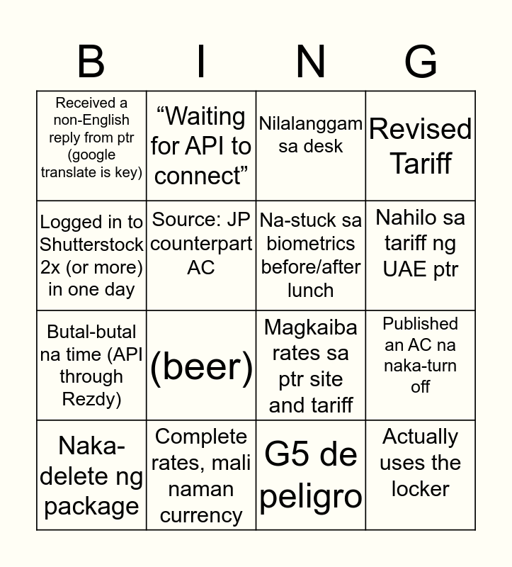 This bingo card has 20 words: Naka-delete ng package, “What’s your source?”, Nilalanggam sa desk, Published an AC na naka-turn off, PJ OPT? Coffee time!, (beer), G5 de peligro, Revised Tariff, Butal-butal na time (API through Rezdy), “Waiting for API to connect”, Magkaiba rates sa ptr site and tariff, Nahilo sa tariff ng UAE ptr, Received a non-English reply from ptr (google translate is key), Complete rates, mali naman currency, Na-stuck sa biometrics before/after lunch, Naka-dalawang follow-up na kay ptr, wala pa rin, Logged in to Shutterstock 2x (or more) in one day, Source: JP counterpart AC, Special deals brought out the math wizard in you and Actually uses the locker.