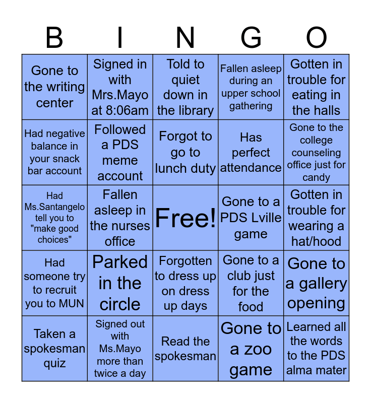 This bingo card has a free space and 24 words: Parked in the circle, Signed out with Ms.Mayo more than twice a day, Forgot to go to lunch duty, Taken a spokesman quiz, Gotten in trouble for eating in the halls, Gone to the writing center, Had negative balance in your snack bar account, Signed in with Mrs.Mayo at 8:06am, Gone to a PDS Lville game, Forgotten to dress up on dress up days, Has perfect attendance, Had Ms.Santangelo tell you to "make good choices", Gone to a club just for the food, Gone to a gallery opening, Followed a PDS meme account, Gone to a zoo game, Gotten in trouble for wearing a hat/hood, Told to quiet down in the library, Gone to the college counseling office just for candy, Fallen asleep in the nurses office, Learned all the words to the PDS alma mater, Had someone try to recruit you to MUN, Fallen asleep during an upper school gathering and Read the spokesman.