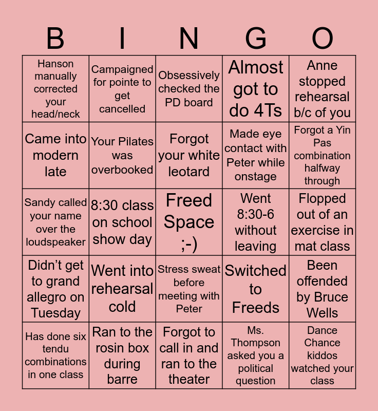 This bingo card has a free space and 24 words: Went into rehearsal cold, Ran to the rosin box during barre, Forgot your white leotard, Has done six tendu combinations in one class, Anne stopped rehearsal b/c of you, Hanson manually corrected your head/neck, Came into modern late, Campaigned for pointe to get cancelled, Went 8:30-6 without leaving, Stress sweat before meeting with Peter, Made eye contact with Peter while onstage, Sandy called your name over the loudspeaker, Switched to Freeds, Been offended by Bruce Wells, Your Pilates was overbooked, Ms. Thompson asked you a political question, Flopped out of an exercise in mat class, Obsessively checked the PD board, Forgot a Yin Pas combination halfway through, 8:30 class on school show day, Dance Chance kiddos watched your class, Didn’t get to grand allegro on Tuesday, Almost got to do 4Ts and Forgot to call in and ran to the theater.