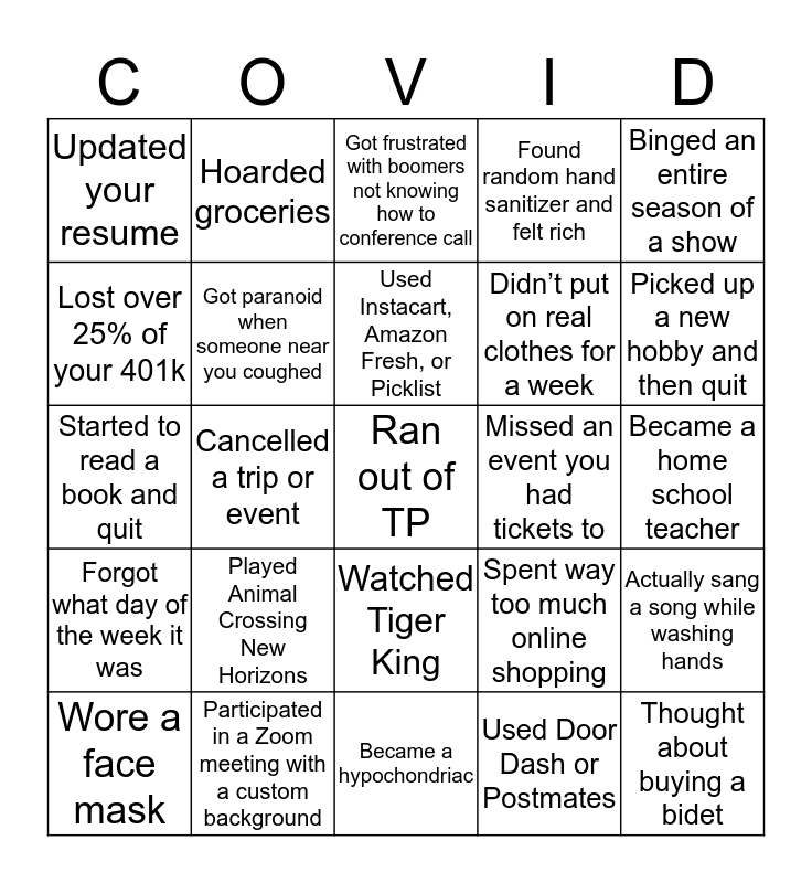 This bingo card has a free space and 24 words: Played Animal Crossing New Horizons, Participated in a Zoom meeting with a custom background, Used Instacart, Amazon Fresh, or Picklist, Wore a face mask, Binged an entire season of a show, Updated your resume, Lost over 25% of your 401k, Hoarded groceries, Missed an event you had tickets to, Watched Tiger King, Didn’t put on real clothes for a week, Started to read a book and quit, Spent way too much online shopping, Actually sang a song while washing hands, Got paranoid when someone near you coughed, Used Door Dash or Postmates, Became a home school teacher, Got frustrated with boomers not knowing how to conference call, Picked up a new hobby and then quit, Cancelled a trip or event, Thought about buying a bidet, Forgot what day of the week it was, Found random hand sanitizer and felt rich and Became a hypochondriac.