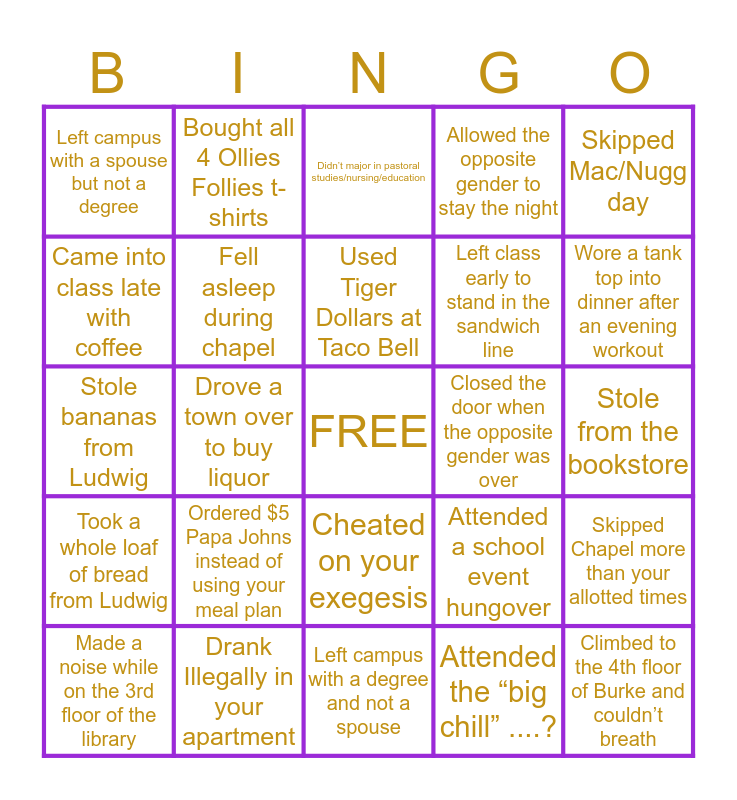 This bingo card has a free space and 24 words: Ordered $5 Papa Johns instead of using your meal plan, Drank Illegally in your apartment, Used Tiger Dollars at Taco Bell, Made a noise while on the 3rd floor of the library, Skipped Mac/Nugg day, Left campus with a spouse but not a degree, Came into class late with coffee, Bought all 4 Ollies Follies t-shirts, Closed the door when the opposite gender was over, Cheated on your exegesis, Left class early to stand in the sandwich line, Stole bananas from Ludwig, Attended a school event hungover, Skipped Chapel more than your allotted times, Fell asleep during chapel, Attended the “big chill” ....?, Stole from the bookstore, Didn’t major in pastoral studies/nursing/education, Wore a tank top into dinner after an evening workout, Drove a town over to buy liquor, Climbed to the 4th floor of Burke and couldn’t breath, Took a whole loaf of bread from Ludwig, Allowed the opposite gender to stay the night and Left campus with a degree and not a spouse.