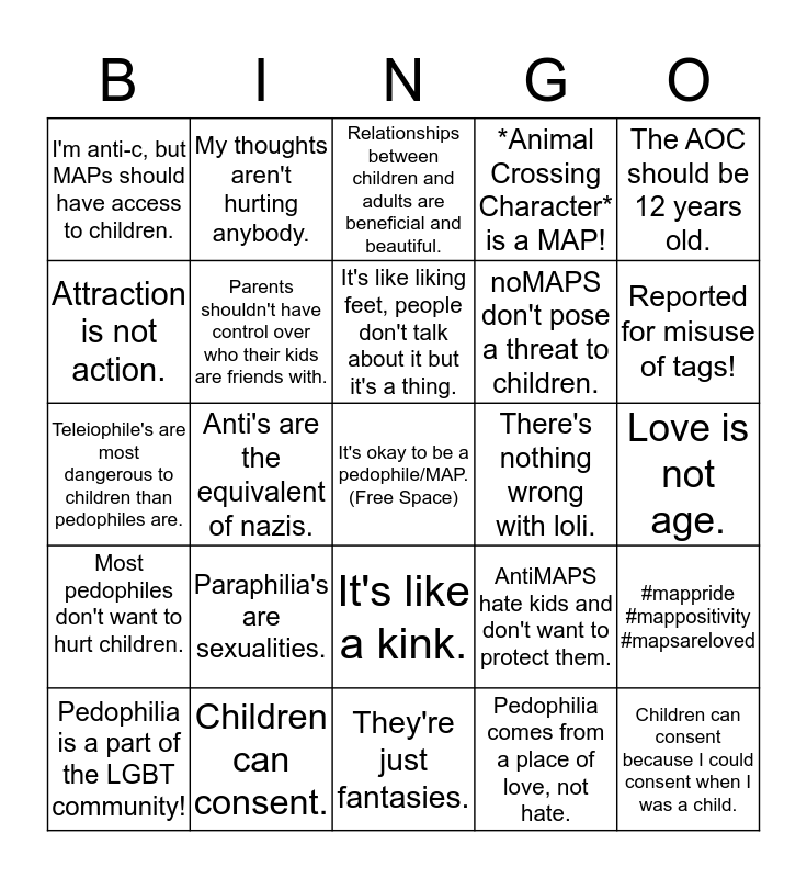 This bingo card has a free space and 24 words: Paraphilia's are sexualities., Children can consent., It's like liking feet, people don't talk about it but it's a thing., Pedophilia is a part of the LGBT community!, The AOC should be 12 years old., I'm anti-c, but MAPs should have access to children., Attraction is not action., My thoughts aren't hurting anybody., There's nothing wrong with loli., It's like a kink., noMAPS don't pose a threat to children., Teleiophile's are most dangerous to children than pedophiles are., AntiMAPS hate kids and don't want to protect them., #mappride #mappositivity #mapsareloved, Parents shouldn't have control over who their kids are friends with., Pedophilia comes from a place of love, not hate., Love is not age., Relationships between children and adults are beneficial and beautiful., Reported for misuse of tags!, Anti's are the equivalent of nazis., Children can consent because I could consent when I was a child., Most pedophiles don't want to hurt children., *Animal Crossing Character* is a MAP! and They're just fantasies..