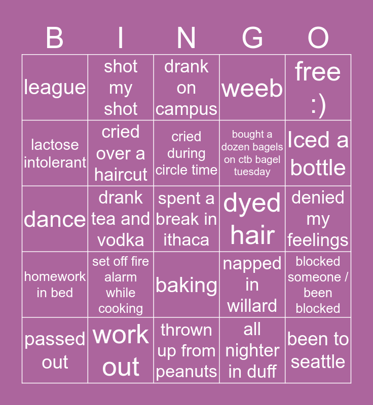 This bingo card has a free space and 24 words: set off fire alarm while cooking, work out, cried during circle time, passed out, free :), league, lactose intolerant, shot my shot, dyed hair, baking, bought a dozen bagels on ctb bagel tuesday, dance, napped in willard, blocked someone / been blocked, cried over a haircut, all nighter in duff, denied my feelings, drank on campus, Iced a bottle, drank tea and vodka, been to seattle, homework in bed, weeb and thrown up from peanuts.