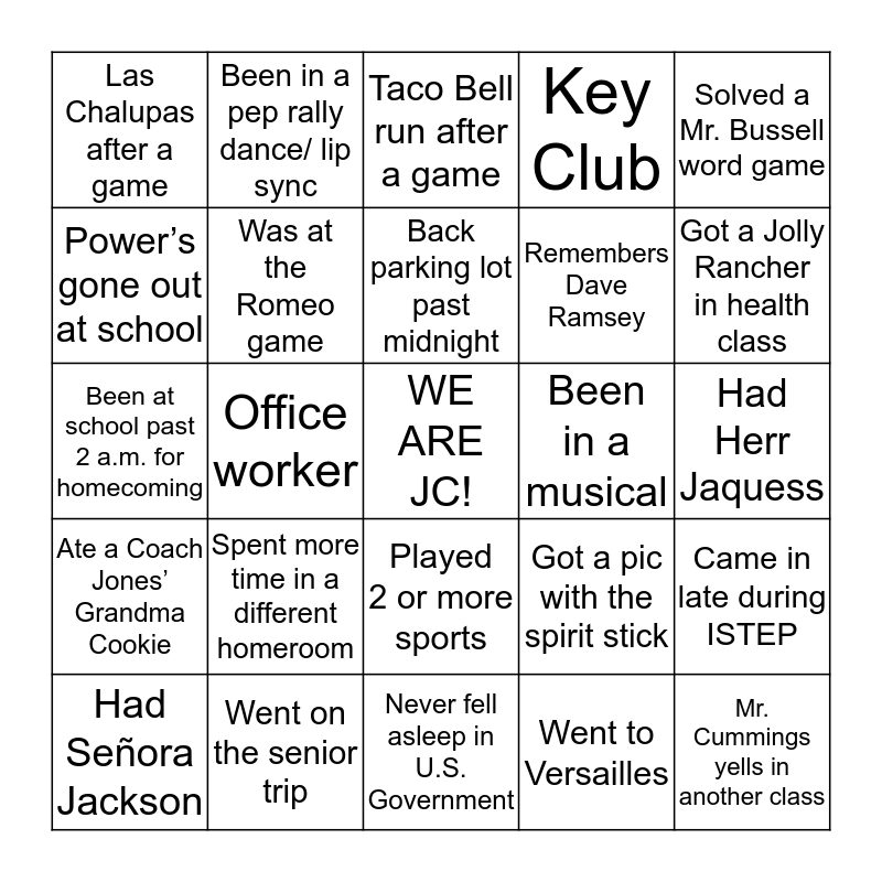 This bingo card has a free space and 24 words: Spent more time in a different homeroom, Went on the senior trip, Back parking lot past midnight, Had Señora Jackson, Solved a Mr. Bussell word game, Las Chalupas after a game, Power’s gone out at school, Been in a pep rally dance/ lip sync, Been in a musical, Played 2 or more sports, Remembers Dave Ramsey, Been at school past 2 a.m. for homecoming, Got a pic with the spirit stick, Came in late during ISTEP, Was at the Romeo game, Went to Versailles, Had Herr Jaquess, Taco Bell run after a game, Got a Jolly Rancher in health class, Office worker, Mr. Cummings yells in another class, Ate a Coach Jones’ Grandma Cookie, Key Club and Never fell asleep in U.S. Government.
