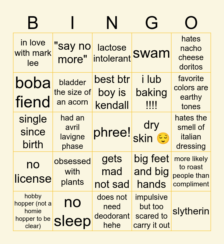 This bingo card has a free space and 24 words: obsessed with plants, no sleep, best btr boy is kendall, hobby hopper (not a homie hopper to be clear), hates nacho cheese doritos, in love with mark lee, boba fiend, "say no more", dry skin 😌, gets mad not sad, i lub baking !!!!, single since birth, big feet and big hands, more likely to roast people than compliment, bladder the size of an acorn, impulsive but too scared to carry it out, hates the smell of italian dressing, lactose intolerant, favorite colors are earthy tones, had an avril lavigne phase, slytherin, no license, swam and does not need deodorant hehe.