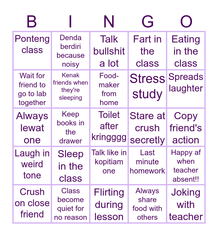 This bingo card has a free space and 24 words: Crush on close friend, Sleep in the class, Food-maker from home, Always share food with others, Eating in the class, Ponteng class, Denda berdiri because noisy, Talk bullshit a lot, Stare at crush secretly, Copy friend's action, Always lewat one, Kenak friends when they're sleeping, Last minute homework, Happy af when teacher absent!!, Wait for friend to go to lab together, Class become quiet for no reason, Flirting during lesson, Fart in the class, Spreads laughter, Laugh in weird tone, Keep books in the drawer, Talk like in kopitiam one, Stress study and Joking with teacher.