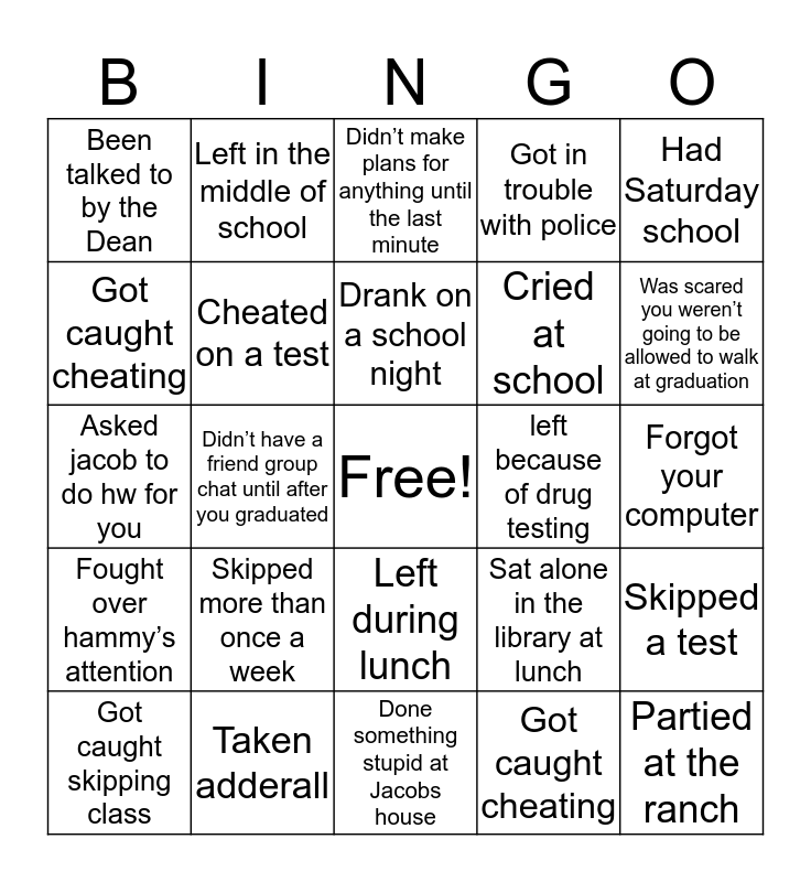 This bingo card has a free space and 24 words: Skipped more than once a week, Taken adderall, Drank on a school night, Got caught skipping class, Had Saturday school, Been talked to by the Dean, Got caught cheating, Left in the middle of school, left because of drug testing, Left during lunch, Cried at school, Asked jacob to do hw for you, Sat alone in the library at lunch, Skipped a test, Cheated on a test, Got caught cheating, Forgot your computer, Didn’t make plans for anything until the last minute, Was scared you weren’t going to be allowed to walk at graduation, Didn’t have a friend group chat until after you graduated, Partied at the ranch, Fought over hammy’s attention, Got in trouble with police and Done something stupid at Jacobs house.