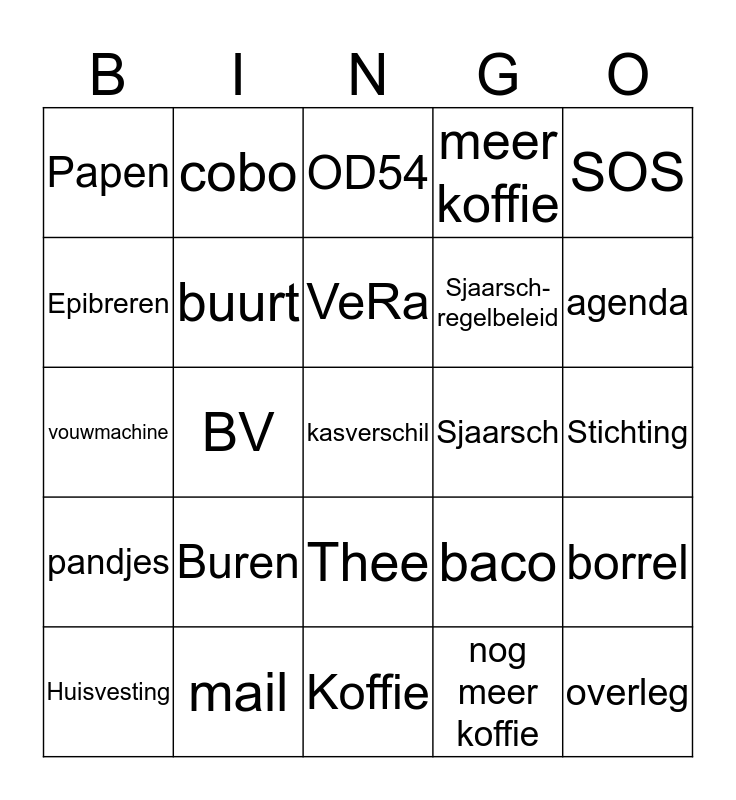 This bingo card has 25 words: Buren, Koffie, VeRa, Huisvesting, SOS, Papen, Epibreren, cobo, Sjaarsch, Thee, Sjaarsch-regelbeleid, vouwmachine, baco, borrel, buurt, overleg, Stichting, OD54, agenda, BV, kasverschil, mail, pandjes, meer koffie and nog meer koffie.