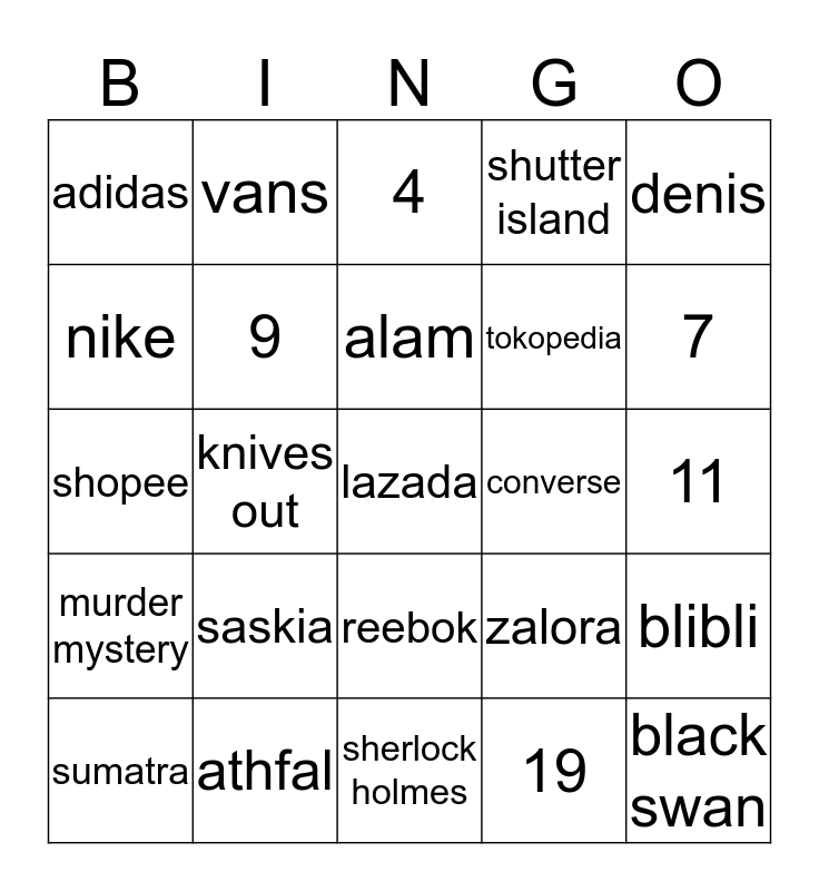 This bingo card has a free space and 24 words: saskia, athfal, alam, sumatra, denis, adidas, nike, vans, converse, reebok, tokopedia, shopee, zalora, blibli, 9, 19, 11, 4, 7, knives out, black swan, murder mystery, shutter island and sherlock holmes.