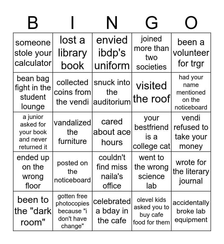 This bingo card has 25 words: posted on the noticeboard, celebrated a bday in the cafe, snuck into the auditorium, been to the "dark room", been a volunteer for trgr, someone stole your calculator, bean bag fight in the student lounge, lost a library book, your bestfriend is a college cat, couldn't find miss naila's office, visited the roof, a junior asked for your book and never returned it, went to the wrong science lab, wrote for the literary journal, collected coins from the vendi, accidentally broke lab equipment, vendi refused to take your money, envied ibdp's uniform, had your name mentioned on the noticeboard, vandalized the furniture, cared about ace hours, gotten free photocopies because "i don't have change", ended up on the wrong floor, joined more than two societies and olevel kids asked you to buy cafe food for them.