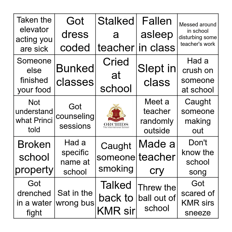 This bingo card has a free space and 24 words: Had a specific name at school, Sat in the wrong bus, Cried at school, Got drenched in a water fight, Messed around in school disturbing some teacher's work, Taken the elevator acting you are sick, Someone else finished your food, Got dress coded, Meet a teacher randomly outside, Caught someone smoking, Slept in class, Not understand what Princi told, Made a teacher cry, Don't know the school song, Bunked classes, Threw the ball out of school, Caught someone making out, Stalked a teacher, Had a crush on someone at school, Got counseling sessions, Got scared of KMR sirs sneeze, Broken school property, Fallen asleep in class and Talked back to KMR sir.