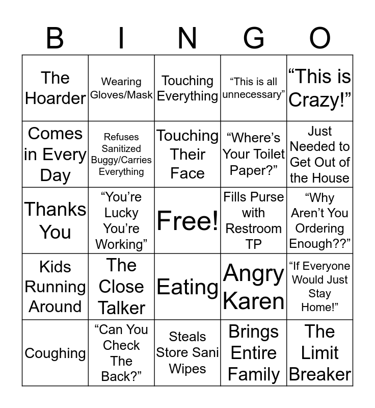 This bingo card has a free space and 24 words: The Close Talker, “Can You Check The Back?”, Touching Their Face, Coughing, “This is Crazy!”, The Hoarder, Comes in Every Day, Wearing Gloves/Mask, Fills Purse with Restroom TP, Eating, “Where’s Your Toilet Paper?”, Thanks You, Angry Karen, “If Everyone Would Just Stay Home!”, Refuses Sanitized Buggy/Carries Everything, Brings Entire Family, “Why Aren’t You Ordering Enough??”, Touching Everything, Just Needed to Get Out of the House, “You’re Lucky You’re Working”, The Limit Breaker, Kids Running Around, “This is all unnecessary” and Steals Store Sani Wipes.