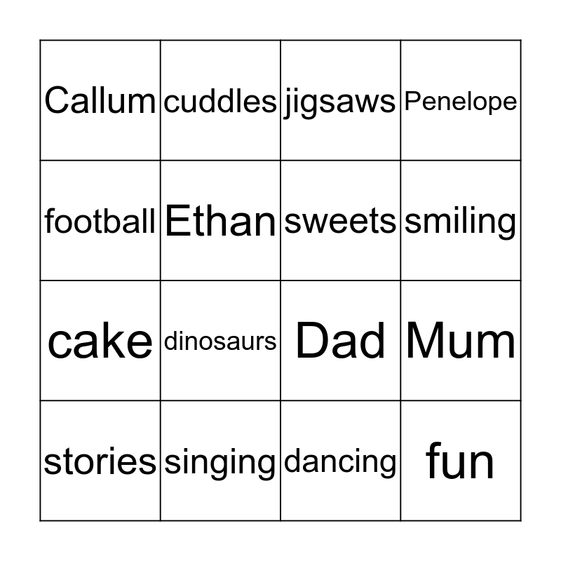 This bingo card has 16 words: singing, Mum, jigsaws, Callum, cake, cuddles, Dad, dancing, football, Ethan, stories, Penelope, dinosaurs, smiling, sweets and fun.