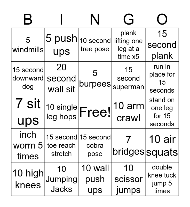 This bingo card has a free space and 24 words: 15 second toe reach stretch, 10 Jumping Jacks, 5 burpees, 10 high knees, 15 second plank, 5 windmills, 15 second downward dog, 5 push ups, 10 arm crawl, 15 second cobra pose, 15 second superman, 7 sit ups, 7 bridges, 10 air squats, 20 second wall sit, 10 scissor jumps, stand on one leg for 15 seconds, 10 second tree pose, run in place for 15 seconds, 10 single leg hops, double knee tuck jump 5 times, inch worm 5 times, plank lifting one leg at a time x5 and 10 wall push ups.