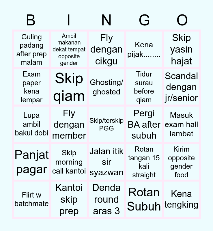 This bingo card has 25 words: Panjat pagar, Kantoi skip prep, Skip/terskip PGG, Rotan Subuh, Skip yasin hajat, Guling padang after prep malam, Ambil makanan dekat tempat opposite gender, Fly dengan cikgu, Pergi BA after subuh, Kirim opposite gender food, Exam paper kena lempar, Skip qiam, Denda round aras 3, Rotan tangan 15 kali straight, Scandal dengan jr/senior, Flirt w batchmate, Fly dengan member, Ghosting/ ghosted, Tidur surau before qiam, Masuk exam hall lambat, Lupa ambil bakul dobi, Skip morning call kantoi, Jalan itik sir syazwan, Kena pijak........ and Kena tengking.