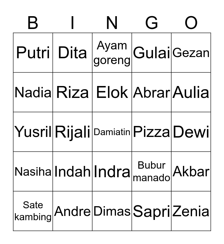 This bingo card has a free space and 24 words: Indah, Andre, Elok, Sate kambing, Gezan, Putri, Nadia, Dita, Pizza, Indra, Abrar, Yusril, Bubur manado, Akbar, Riza, Sapri, Dewi, Ayam goreng, Aulia, Rijali, Zenia, Nasiha, Gulai and Dimas.