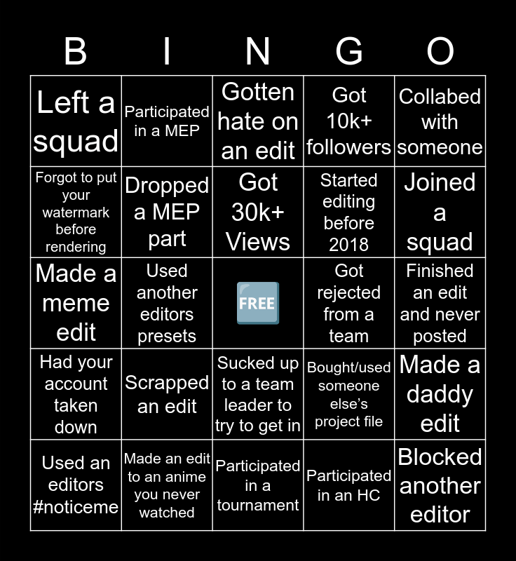 This bingo card has a free space and 24 words: Scrapped an edit, Made an edit to an anime you never watched, Got 30k+ Views, Used an editors #noticeme, Collabed with someone, Left a squad, Forgot to put your watermark before rendering, Participated in a MEP, Got rejected from a team, Sucked up to a team leader to try to get in, Started editing before 2018, Made a meme edit, Bought/used someone else’s project file, Made a daddy edit, Dropped a MEP part, Participated in an HC, Finished an edit and never posted, Gotten hate on an edit, Joined a squad, Used another editors presets, Blocked another editor, Had your account taken down, Got 10k+ followers and Participated in a tournament.