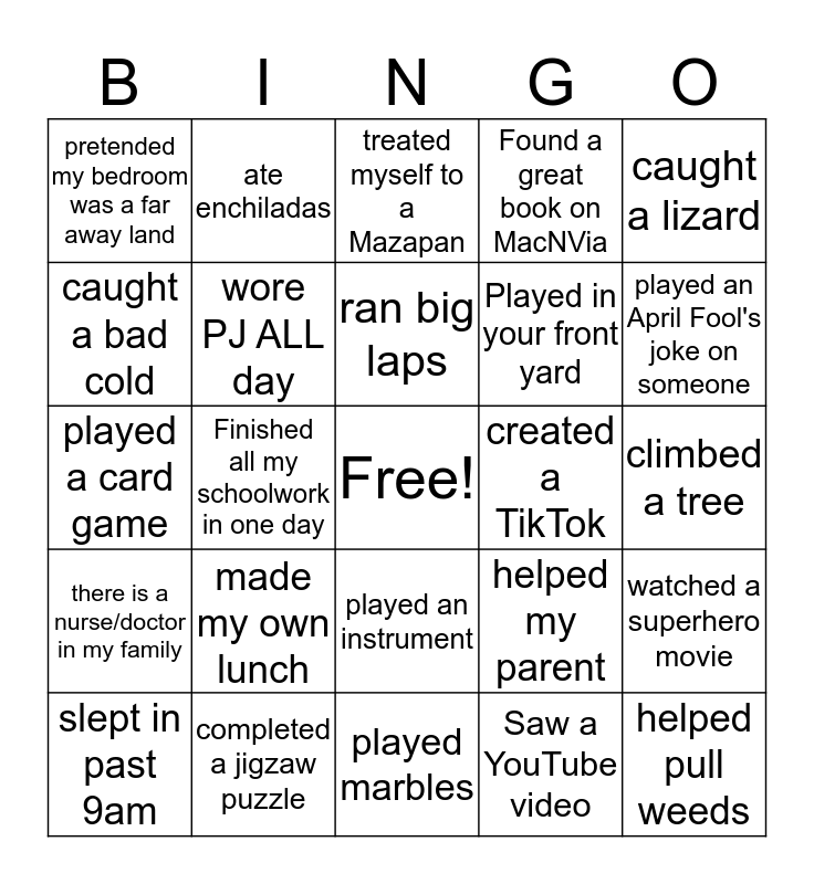 This bingo card has a free space and 24 words: made my own lunch, completed a jigzaw puzzle, ran big laps, slept in past 9am, caught a lizard, pretended my bedroom was a far away land, caught a bad cold, ate enchiladas, created a TikTok, played an instrument, Played in your front yard, played a card game, helped my parent, watched a superhero movie, wore PJ ALL day, Saw a YouTube video, climbed a tree, treated myself to a Mazapan, played an April Fool's joke on someone, Finished all my schoolwork in one day, helped pull weeds, there is a nurse/doctor in my family, Found a great book on MacNVia and played marbles.
