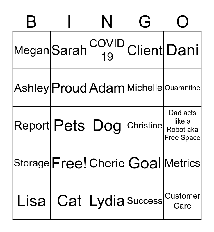 This bingo card has 25 words: Free!, Lydia, Adam, Lisa, Dani, Megan, Ashley, Sarah, Christine, Cherie, Michelle, Report, Goal, Metrics, Proud, Customer Care, Dad acts like a Robot aka Free Space, COVID 19, Quarantine, Pets, Dog, Cat, Storage, Client and Success.