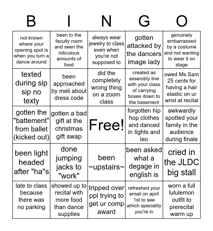 This bingo card has a free space and 24 words: done jumping jacks to "work", showed up to recital with more food than dance supplies, did the completely wrong thing on a zoom class, late to class because there was no parking, genuinely embarrassed by a costume and not wanting to wear it on stage, not known where your opening spot is when you turn a dance around, texted during sip sip no texty, been to the faculty room and seen the ridiculous amounts of food, forgotten hip hop clothes and danced in tights and leo, been ~upstairs~, created as assembly line with your class of carrying boxes down to the basement, gotten the "battement" from ballet (kicked out), been asked what a degage in english is, cried in the JLDC big stall, been approached by meli about dress code, refreshed your email on april 1st to see which speciality you're in, awkwardly spotted your family in the audience during finale, always wear jewelry to class even when you're not supposed to, owed Ms.Sam 25 cents for having a hair elastic on ur wrist at recital, gotten a bad gift at the christmas gift swap, worn a full lululemon outfit to prerecital warm up, been light headed after "ha"s, gotten attacked by the dancers image lady and tripped over ppl trying to get ur comp award.