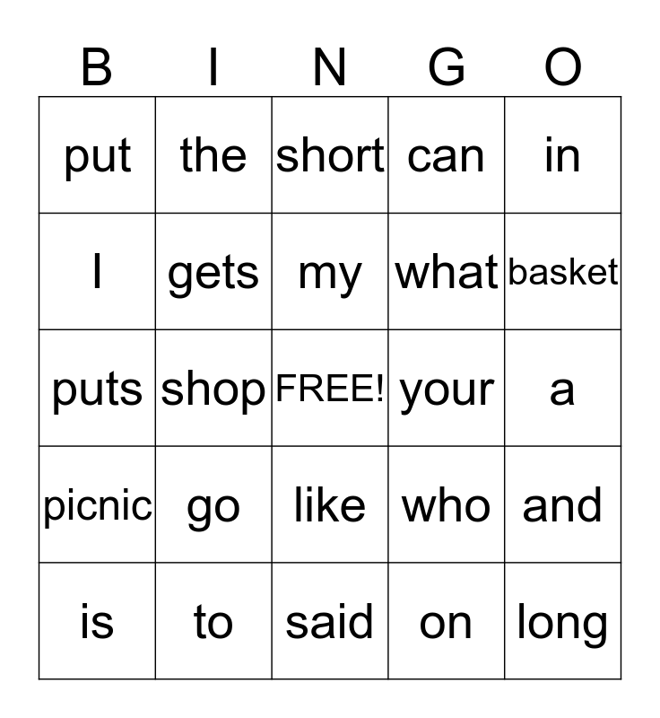 This bingo card has a free space and 24 words: go, to, my, is, in, put, I, the, your, like, what, puts, who, and, gets, on, a, short, basket, shop, long, picnic, can and said.