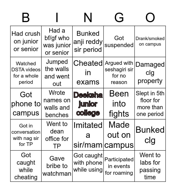 This bingo card has a free space and 24 words: Went to dean office for TP, Gave bribe to watchman, Cheated in exams, Got caught while cheating, Drank/smoked on campus, Had crush on junior or senior, Watched DSTA videos for a whole period, Had a bf/gf who was junior or senior, Been into fights, Imitated a sir/mam, Argued with seshagiri sir for no reason, Got phone to campus, Made out on campus, Bunked clg, Jumped the walls and went out, Participated in events for roaming, Slept in 5th floor for more than one period, Bunked anji reddy sir period, Damaged clg property, Wrote names on walls and benches, Went to labs for passing time, Got in conversation with nag sir for TP, Got suspended and Got caught with phone while using.