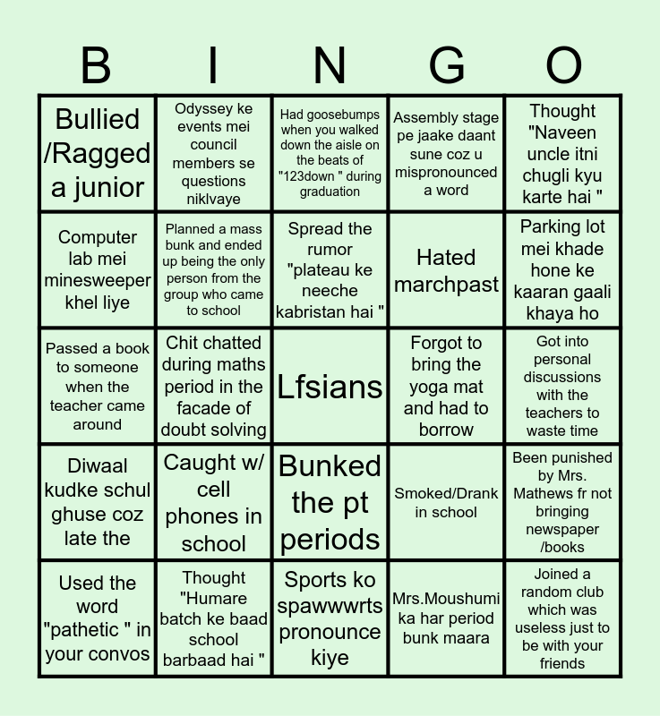 This bingo card has a free space and 24 words: Caught w/ cell phones in school, Thought "Humare batch ke baad school barbaad hai ", Spread the rumor "plateau ke neeche kabristan hai ", Used the word "pathetic " in your convos, Thought "Naveen uncle itni chugli kyu karte hai ", Bullied /Ragged a junior, Computer lab mei minesweeper khel liye, Odyssey ke events mei council members se questions niklvaye, Forgot to bring the yoga mat and had to borrow, Bunked the pt periods, Hated marchpast, Passed a book to someone when the teacher came around, Smoked/Drank in school, Been punished by Mrs. Mathews fr not bringing newspaper /books, Planned a mass bunk and ended up being the only person from the group who came to school, Mrs.Moushumi ka har period bunk maara, Got into personal discussions with the teachers to waste time, Had goosebumps when you walked down the aisle on the beats of "123down " during graduation, Parking lot mei khade hone ke kaaran gaali khaya ho, Chit chatted during maths period in the facade of doubt solving, Joined a random club which was useless just to be with your friends, Diwaal kudke schul ghuse coz late the, Assembly stage pe jaake daant sune coz u mispronounced a word and Sports ko spawwwrts pronounce kiye.