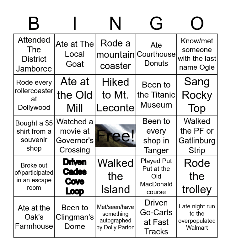 This bingo card has a free space and 24 words: Driven Cades Cove Loop, Been to Clingman's Dome, Hiked to Mt. Leconte, Ate at the Oak's Farmhouse, Know/met someone with the last name Ogle, Attended The District Jamboree, Rode every rollercoaster at Dollywood, Ate at The Local Goat, Been to every shop in Tanger, Walked the Island, Been to the Titanic Museum, Bought a $5 shirt from a souvenir shop, Played Put Put at the Old MacDonald course, Rode the trolley, Ate at the Old Mill, Driven Go-Carts at Fast Tracks, Walked the PF or Gatlinburg Strip, Rode a mountain coaster, Sang Rocky Top, Watched a movie at Governor's Crossing, Late night run to the overpopulated Walmart, Broke out of/participated in an escape room, Ate Courthouse Donuts and Met/seen/have something autographed by Dolly Parton.