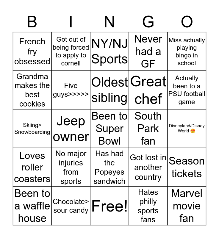 This bingo card has 25 words: Loves roller coasters, Chocolate> sour candy, Been to Super Bowl, Hates philly sports fans, Miss actually playing bingo in school, French fry obsessed, Got out of being forced to apply to cornell, NY/NJ Sports, South Park fan, Season tickets, Grandma makes the best cookies, Five guys>>>>>, Free!, Got lost in another country, Actually been to a PSU football game, Been to a waffle house, Jeep owner, Oldest sibling, Great chef, Disneyland/Disney World 😍, Skiing> Snowboarding, No major injuries from sports, Has had the Popeyes sandwich, Never had a GF and Marvel movie fan.