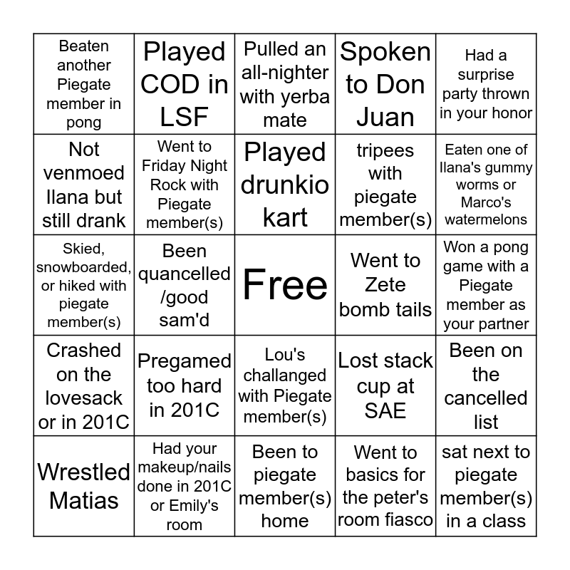 This bingo card has a free space and 24 words: Pregamed too hard in 201C, Had your makeup/nails done in 201C or Emily's room, Played drunkio kart, Wrestled Matias, Had a surprise party thrown in your honor, Beaten another Piegate member in pong, Not venmoed Ilana but still drank, Played COD in LSF, Went to Zete bomb tails, Lou's challanged with Piegate member(s), tripees with piegate member(s), Skied, snowboarded, or hiked with piegate member(s), Lost stack cup at SAE, Been on the cancelled list, Went to Friday Night Rock with Piegate member(s), Went to basics for the peter's room fiasco, Won a pong game with a Piegate member as your partner, Pulled an all-nighter with yerba mate, Eaten one of Ilana's gummy worms or Marco's watermelons, Been quancelled /good sam'd, sat next to piegate member(s) in a class, Crashed on the lovesack or in 201C, Spoken to Don Juan and Been to piegate member(s) home.