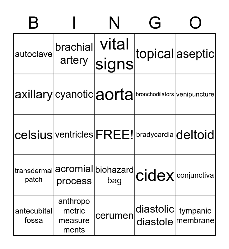 This bingo card has a free space and 24 words: acromial process, anthropo metric measure ments, aorta, antecubital fossa, aseptic, autoclave, axillary, brachial artery, bradycardia, biohazard bag, bronchodilators, celsius, cidex, conjunctiva, cyanotic, diastolic diastole, deltoid, vital signs, venipuncture, ventricles, tympanic membrane, transdermal patch, topical and cerumen.