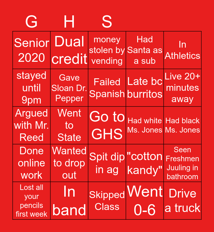 This bingo card has a free space and 24 words: Wanted to drop out, In band, Failed Spanish, Lost all your pencils first week, In Athletics, Senior 2020, stayed until 9pm, Dual credit, Had white Ms. Jones, Spit dip in ag, Late bc burritos, Argued with Mr. Reed, "cotton kandy", Seen Freshmen Juuling in bathroom, Gave Sloan Dr. Pepper, Went 0-6, Had black Ms. Jones, money stolen by vending, Live 20+ minutes away, Went to State, Drive a truck, Done online work, Had Santa as a sub and Skipped Class.