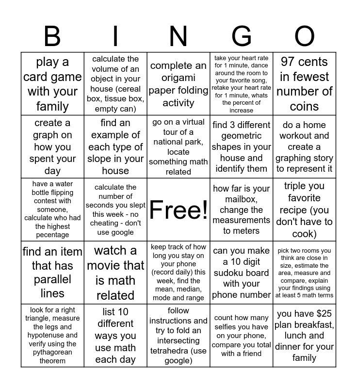 This bingo card has a free space and 24 words: watch a movie that is math related, list 10 different ways you use math each day, go on a virtual tour of a national park, locate something math related, look for a right triangle, measure the legs and hypotenuse and verify using the pythagorean theorem, 97 cents in fewest number of coins, play a card game with your family, create a graph on how you spent your day, calculate the volume of an object in your house (cereal box, tissue box, empty can), how far is your mailbox, change the measurements to meters, keep track of how long you stay on your phone (record daily) this week, find the mean, median, mode and range, find 3 different geometric shapes in your house and identify them, have a water bottle flipping contest with someone, calculate who had the highest pecentage, can you make a 10 digit sudoku board with your phone number, pick two rooms you think are close in size, estimate the area, measure and compare, explain your findings using at least 5 math terms, find an example of each type of slope in your house, count how many selfies you have on your phone, compare you total with a friend, triple you favorite recipe (you don't have to cook), complete an origami paper folding activity, do a home workout and create a graphing story to represent it, calculate the number of seconds you slept this week - no cheating - don't use google, you have $25 plan breakfast, lunch and dinner for your family, find an item that has parallel lines, take your heart rate for 1 minute, dance around the room to your favorite song, retake your heart rate for 1 minute, whats the percent of increase and follow instructions and try to fold an intersecting tetrahedra (use google).