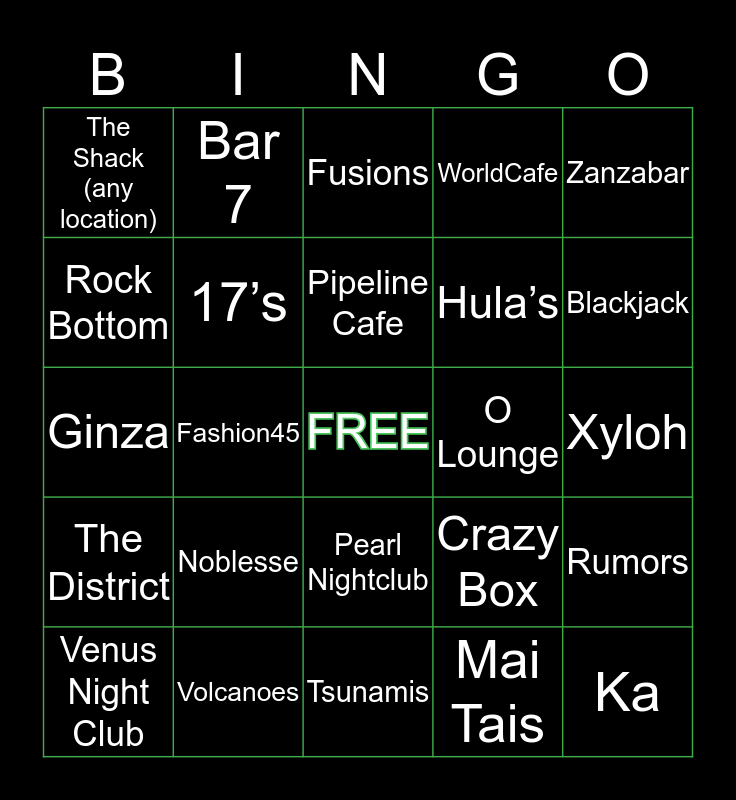 This bingo card has a free space and 24 words: Noblesse, Volcanoes, Pipeline Cafe, Venus Night Club, Zanzabar, The Shack (any location), Rock Bottom, Bar 7, O Lounge, Pearl Nightclub, Hula’s, Ginza, Crazy Box, Rumors, 17’s, Mai Tais, Xyloh, Fusions, Blackjack, Fashion45, Ka, The District, WorldCafe and Tsunamis.
