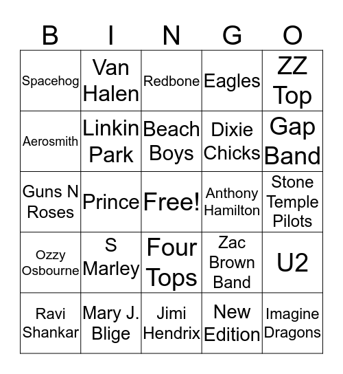 This bingo card has a free space and 29 words: Ravi Shankar, Florida Georgia Line, Prince, Commodores, Spacehog, Redbone, Linkin Park, S Marley, Anthony Hamilton, Mary J. Blige, Stone Temple Pilots, Imagine Dragons, Jimi Hendrix, New Edition, Gap Band, D'Angelo, Four Tops, Ozzy Osbourne, ZZ Top, Guns N Roses, Zac Brown Band, Rascal Flatts, Dixie Chicks, Aerosmith, Eagles, Van Halen, U2, Beach Boys and Supremes.
