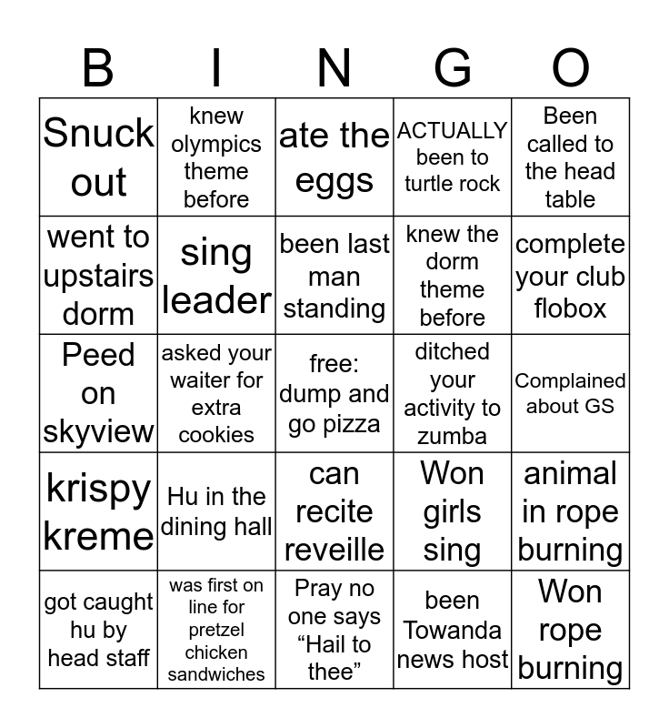 This bingo card has a free space and 24 words: Hu in the dining hall, was first on line for pretzel chicken sandwiches, been last man standing, got caught hu by head staff, Been called to the head table, Snuck out, went to upstairs dorm, knew olympics theme before, ditched your activity to zumba, can recite reveille, knew the dorm theme before, Peed on skyview, Won girls sing, animal in rope burning, sing leader, been Towanda news host, Complained about GS, ate the eggs, complete your club flobox, asked your waiter for extra cookies, Won rope burning, krispy kreme, ACTUALLY been to turtle rock and Pray no one says “Hail to thee”.