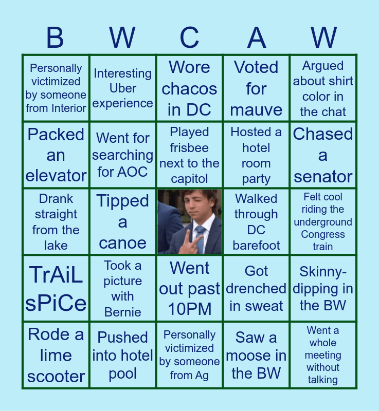 This bingo card has a free space and 24 words: Took a picture with Bernie, Pushed into hotel pool, Played frisbee next to the capitol, Rode a lime scooter, Argued about shirt color in the chat, Personally victimized by someone from Interior, Packed an elevator, Interesting Uber experience, Walked through DC barefoot, Went out past 10PM, Hosted a hotel room party, Drank straight from the lake, Got drenched in sweat, Skinny-dipping in the BW, Went for searching for AOC, Saw a moose in the BW, Felt cool riding the underground Congress train, Wore chacos in DC, Chased a senator, Tipped a canoe, Went a whole meeting without talking, TrAiL sPiCe, Voted for mauve and Personally victimized by someone from Ag.