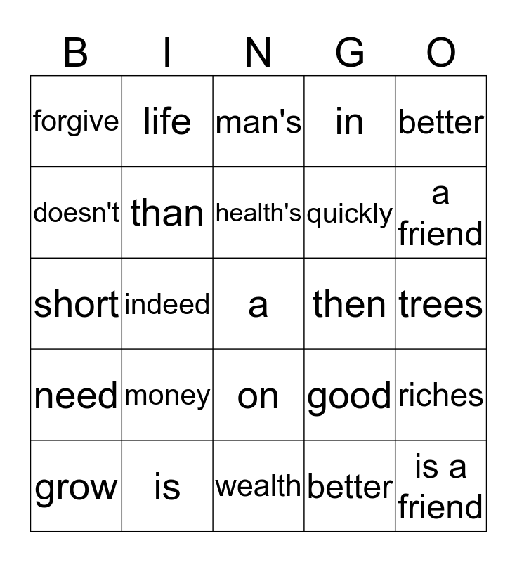 This bingo card has a free space and 24 words: money, is, health's, grow, better, forgive, doesn't, life, then, on, quickly, short, good, riches, than, better, trees, man's, a friend, indeed, is a friend, need, in and wealth.