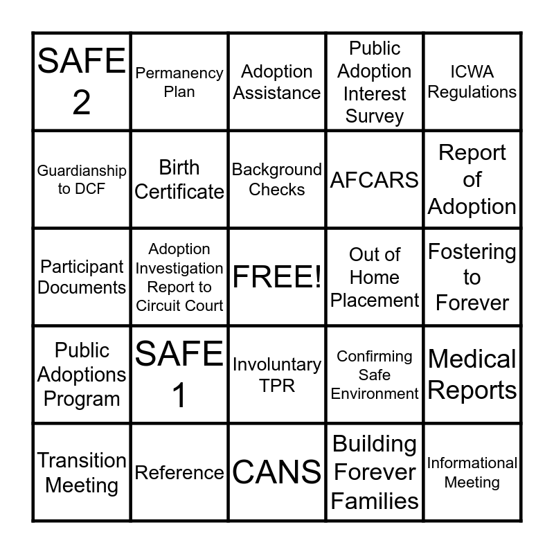 This bingo card has a free space and 24 words: SAFE 1, Reference, Background Checks, Transition Meeting, ICWA Regulations, SAFE 2, Guardianship to DCF, Permanency Plan, Out of Home Placement, Involuntary TPR, AFCARS, Participant Documents, Confirming Safe Environment, Medical Reports, Birth Certificate, Building Forever Families, Fostering to Forever, Adoption Assistance, Report of Adoption, Adoption Investigation Report to Circuit Court, Informational Meeting, Public Adoptions Program, Public Adoption Interest Survey and CANS.