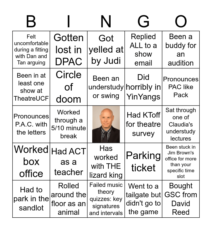 This bingo card has a free space and 24 words: Had ACT as a teacher, Rolled around the floor as an animal, Been an understudy or swing, Had to park in the sandlot, Been a buddy for an audition, Felt uncomfortable during a fitting with Dan and Tan arguing, Been in at least one show at TheatreUCF, Gotten lost in DPAC, Had KToff for theatre survey, Has worked with THE lizard king, Did horribly in YinYangs, Pronounces P.A.C. with the letters, Parking ticket, Been stuck in Jim Brown's office for more than your specific time slot, Circle of doom, Went to a tailgate but didn't go to the game, Sat through one of Claudia's understudy lectures, Got yelled at by Judi, Pronounces PAC like Pack, Worked through a 5/10 minute break, Bought GSC from David Reed, Worked box office, Replied ALL to a show email and Failed music theory quizzes: key signatures and intervals.