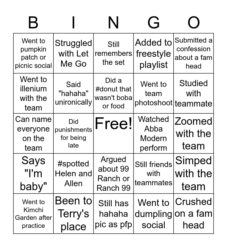 This bingo card has a free space and 24 words: #spotted Helen and Allen, Been to Terry's place, Did a #donut that wasn't boba or food, Went to Kimchi Garden after practice, Submitted a confession about a fam head, Went to pumpkin patch or picnic social, Went to illenium with the team, Struggled with Let Me Go, Watched Abba Modern perform, Argued about 99 Ranch or Ranch 99, Went to team photoshoot, Can name everyone on the team, Still friends with teammates, Simped with the team, Said "hahaha" unironically, Went to dumpling social, Zoomed with the team, Still remembers the set, Studied with teammate, Did punishments for being late, Crushed on a fam head, Says "I'm baby", Added to freestyle playlist and Still has hahaha pic as pfp.