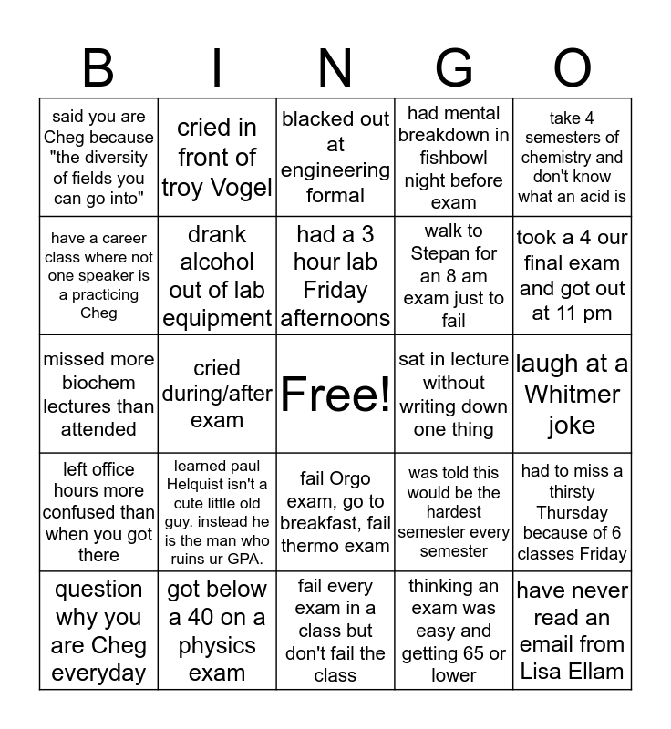 This bingo card has a free space and 24 words: learned paul Helquist isn't a cute little old guy. instead he is the man who ruins ur GPA., got below a 40 on a physics exam, had a 3 hour lab Friday afternoons, question why you are Cheg everyday, take 4 semesters of chemistry and don't know what an acid is, said you are Cheg because "the diversity of fields you can go into", have a career class where not one speaker is a practicing Cheg, cried in front of troy Vogel, sat in lecture without writing down one thing, fail Orgo exam, go to breakfast, fail thermo exam, walk to Stepan for an 8 am exam just to fail, missed more biochem lectures than attended, was told this would be the hardest semester every semester, had to miss a thirsty Thursday because of 6 classes Friday, drank alcohol out of lab equipment, thinking an exam was easy and getting 65 or lower, laugh at a Whitmer joke, blacked out at engineering formal, took a 4 our final exam and got out at 11 pm, cried during/after exam, have never read an email from Lisa Ellam, left office hours more confused than when you got there, had mental breakdown in fishbowl night before exam and fail every exam in a class but don't fail the class.
